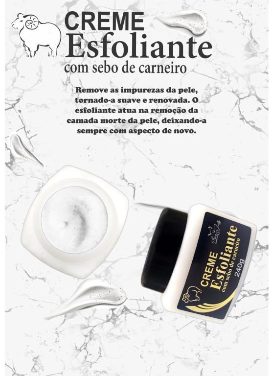 O Creme esfoliante com sebo de carneiro remove as impurezas da pele, tornando-a suave.Renovada, e evitando aspereza nos pés. O esfoliante atua na renovação de camada morta da pele. Deixando-a sempre com aspecto novo.